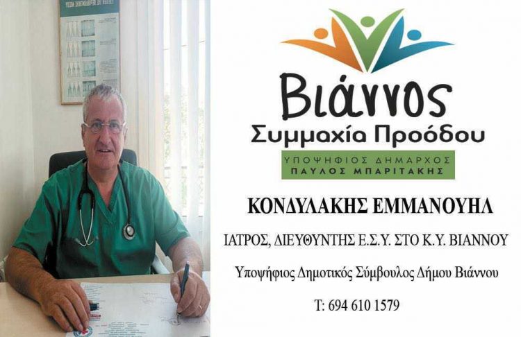 Ο Ιατρός Μανώλης Κονδυλάκης Διευθυντής Ε.Σ.Υ. στο Κέντρο Υγείας Βιάννου είναι υποψήφιος με το συνδυασμό «Βιάννος Συμμαχία Προόδου» του Παύλου Μπαριτάκη.