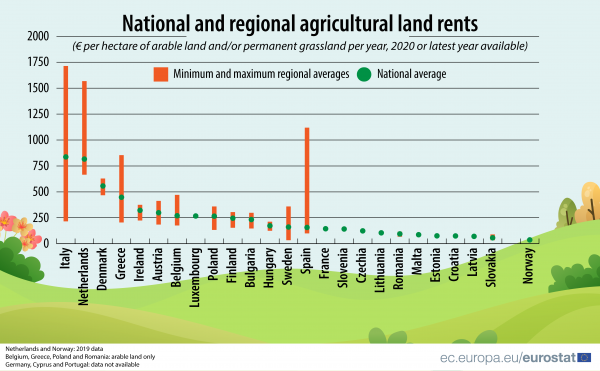Να σημειωθεί, ότι σε όλες τις περιφέρειες της ΕΕ για τις οποίες υπάρχουν διαθέσιμα στοιχεία, η ενοικίαση μόνιμων λιβαδιών ήταν φθηνότερη από την ενοικίαση καλλιεργήσιμης γης.