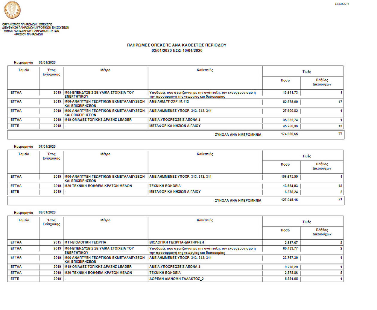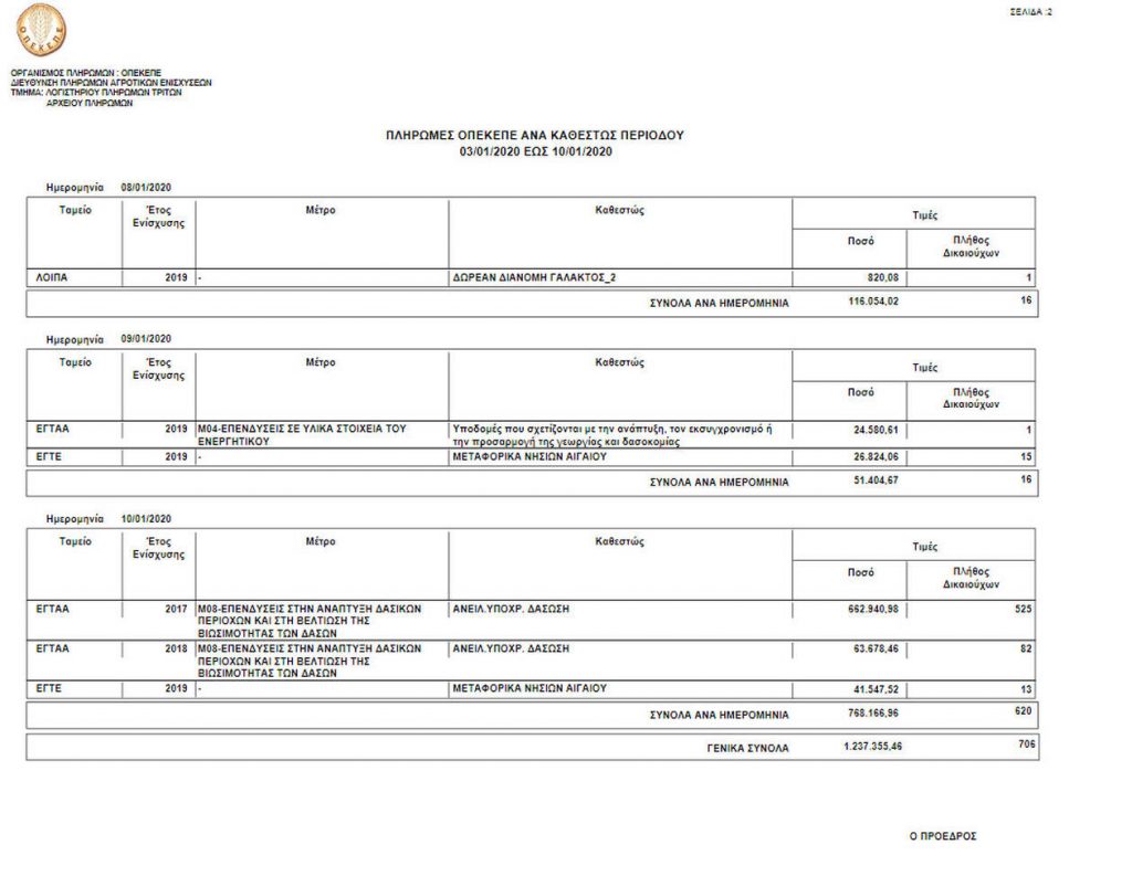 Ο οργανισμός από τις 03/01/2020 έως τις 10/01/2020, κατέβαλε σε 706 δικαιούχους το ποσό των 1.237.355,46 ευρώ.