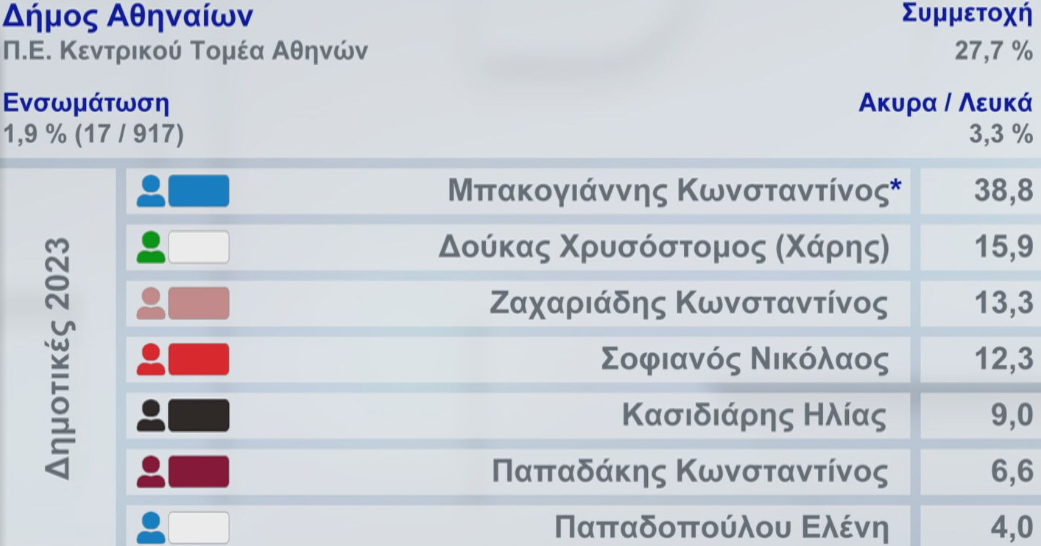 Τα πρώτα επίσημα αποτελέσματα για τον δήμο Αθηναίων βγήκαν και με την ενσωμάτωση στο 1,9% ο Κώστας Μπακογιάννης προηγείται με 38,8%.