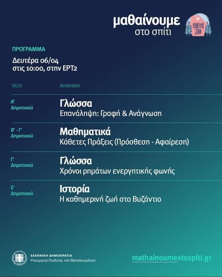 Συνεχίζονται τα μαθήματα στα παιδιά του Δημοτικού από Δευτέρα, με την ΕΡΤ 2 να γνωστοποιεί το πρόγραμμα της.