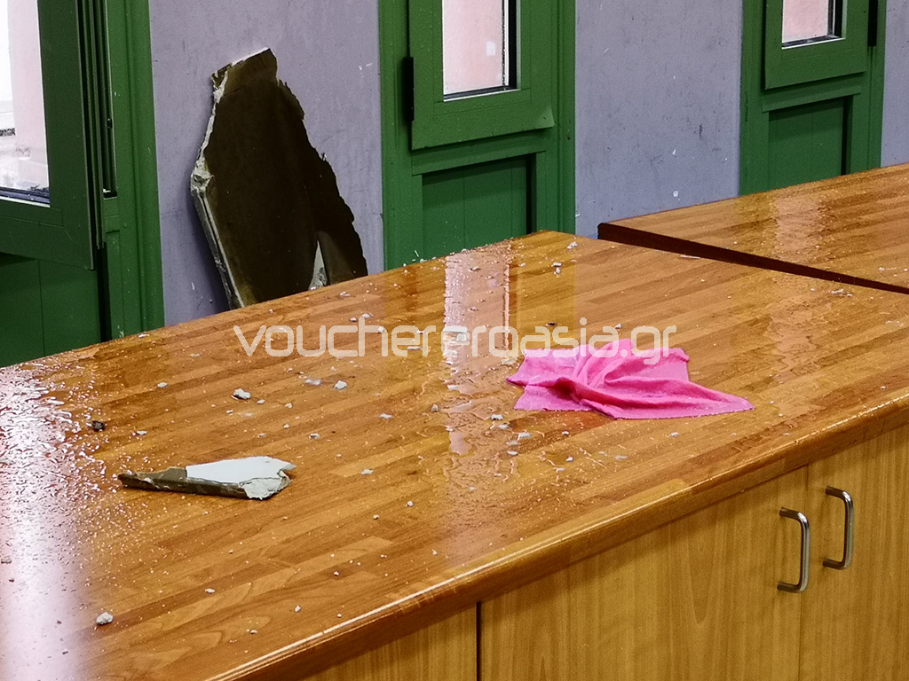 Επίσης αυτό που αντίκρισαν οι μαθητές, επισκεπτόμενοι σήμερα το σχολείο, μόνο προβληματισμό μπορεί να φέρει για την ασφάλεια τους και την ομαλή διεξαγωγή των μαθημάτων. Στην Αίθουσα πολλαπλών χρήσεων του σχολείου υπήρχε μία πολύ μεγάλη τρύπα στην οροφή και γεμάτο νερά μέσα στους χώρους.