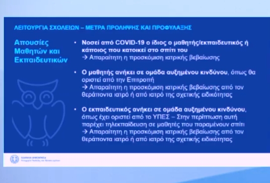 Όσον αφορά στις περιπτώσεις που μαθητές ή εκπαιδευτικοί νοσήσουν, η υπουργός παιδείας ανακοίνωσε μία σειρά από μέτρα.