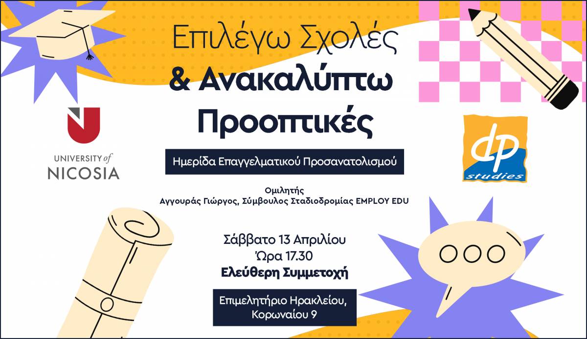 Αυτό το Σάββατο 13/04/2024 και ώρα 17:30 μ.μ. θα πραγματοποιηθεί η ημερίδα Επαγγελματικού Προσανατολισμού με τίτλο: «Επιλέγω Σχολές & Ανακαλύπτω Προοπτικές» που συνδιοργανώνει το Πανεπιστήμιο Λευκωσίας μαζί με τον Εκπαιδευτικό Όμιλο dp studies, στο Επιμελητήριο Ηρακλείου στην αίθουσα Καστελλάκη (Κορωναίου 9, Ηράκλειο Κρήτης).