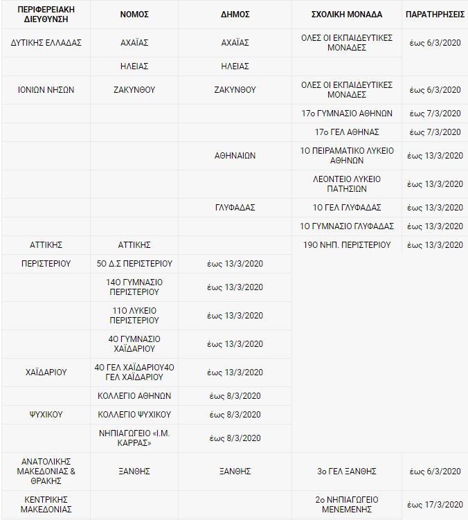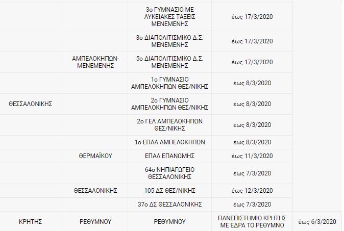 Από 3/3/2020 έως και την 17/3/2020 κλειστά θα μείνουν τα εξής σχολεία: