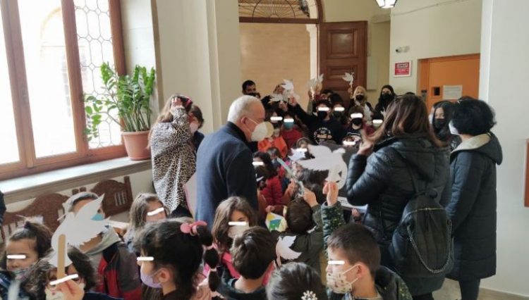 Με μηνύματα ειρήνης «πλημμύρισαν» τη Λότζια μικροί μαθητές που επισκέφθηκαν τον Δήμαρχο Ηρακλείου Βασίλη Λαμπρινό .