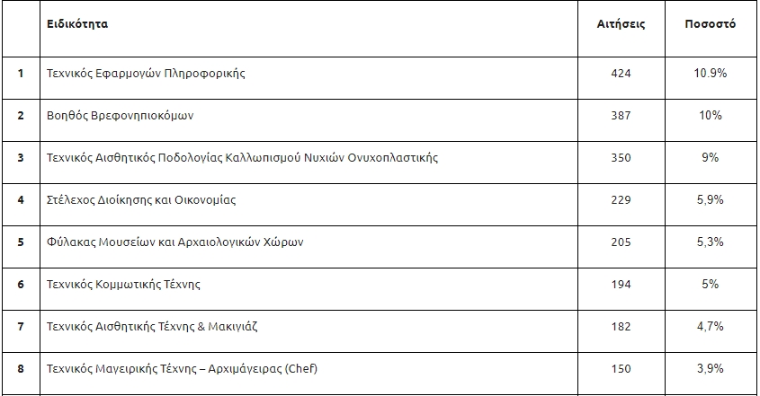 Οι 15 ειδικότητες που συγκέντρωσαν τον μεγαλύτερο αριθμό αιτήσεων ήταν οι εξής: