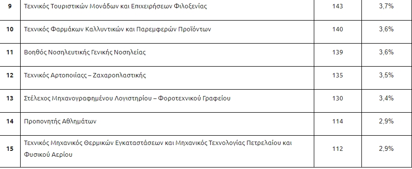 Οι 15 ειδικότητες που συγκέντρωσαν τον μεγαλύτερο αριθμό αιτήσεων ήταν οι εξής: