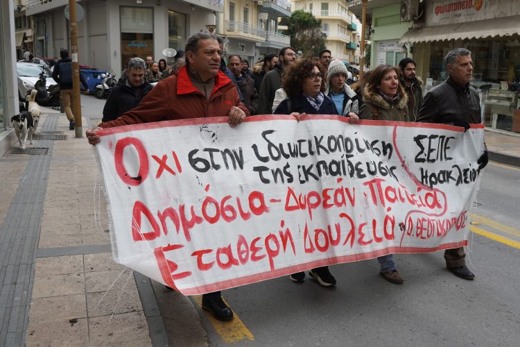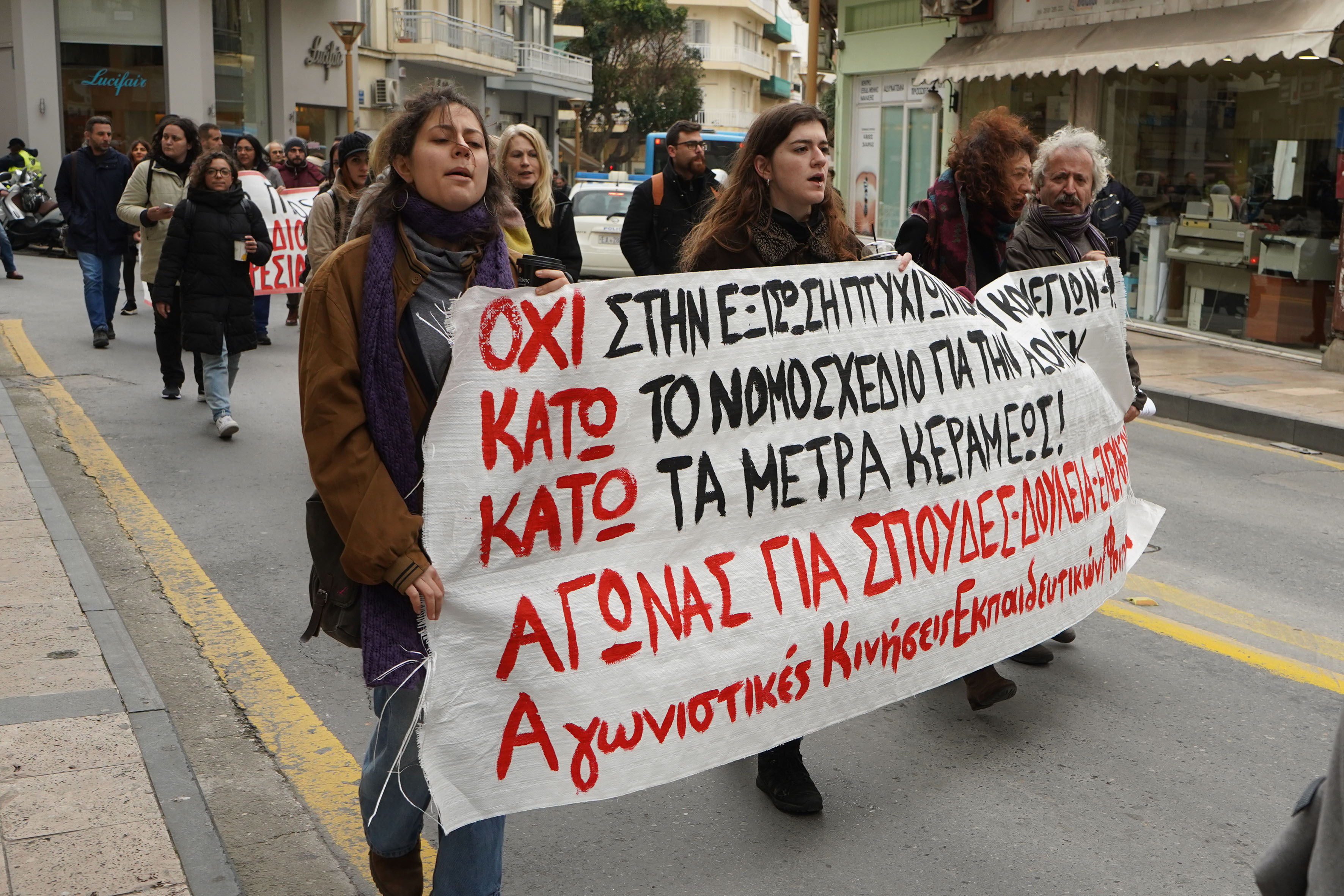 Οι συμμετέχοντες στην κινητοποίηση πραγματοποίησαν πορεία, καταλήγοντας στην Περιφερειακή Διεύθυνση Εκπαίδευσης Κρήτης, όπου και επέδωσαν ψήφισμα με τις θέσεις και τα αιτήματά τους.