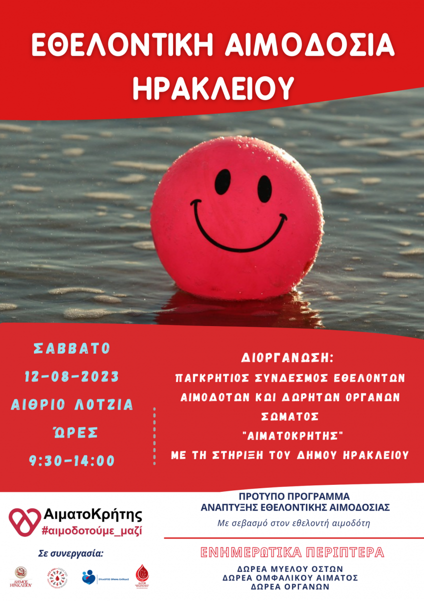 Εθελοντική αιμοδοσία θα πραγματοποιηθεί το Σάββατο 12/08/2023 στο κέντρο της πόλης του Ηρακλείου και συγκεκριμένα στο αίθριο της Λότζια από τις 9:30 έως τις 14:00.