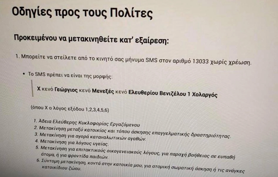 Με SMS στο 13033 χωρίς χρέωση με τα στοιχεία μας θα επιλέγουμε έναν αριθμό για να είναι ο λόγος εξόδου από το σπίτι, μετά το έκτακτο μέτρο απαγόρευσης της κυκλοφορίας που ανακοίνωσε ο Κυριάκος Μητσοτάκης.