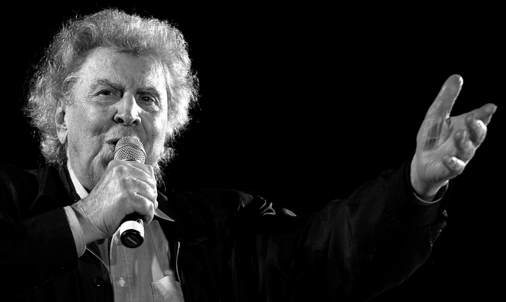 Greece's most prominent composer Mikis Theodorakis performs for his fans after the end of a massive concert for him at Davilla moat in Nicosia, Cyprus, late Tuesday, Oct. 11, 2005. Theodorakis was honored for his contribution to culture. (AP Photo/Philippos Christou)