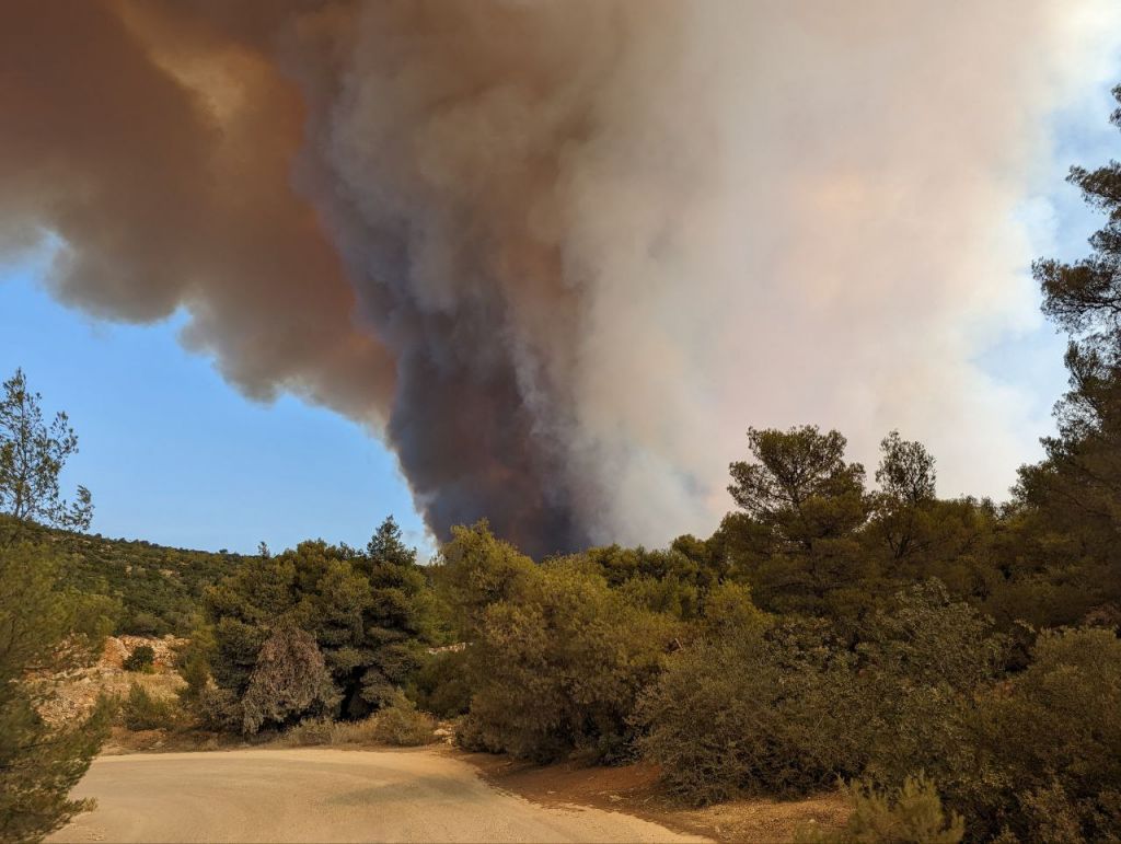 Μάλιστα, η φωτιά στις 12:30 το μεσημέρι φέρεται να είχε φθάσει κοντά στα λατομεία Lafarge, σε απόσταση περίπου 300 μέτρων. Στο σημείο υπάρχει και ένας εκσκαφέας που βοηθά στην μάχη που δίνεται με τις φλόγες.