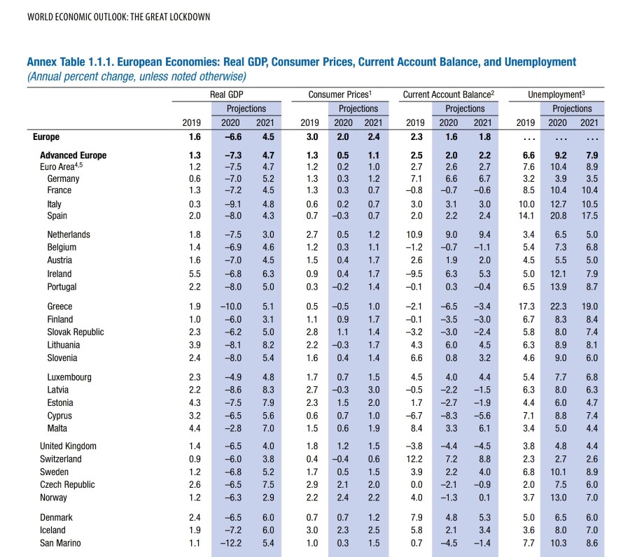 Οι πληροφορίες αναφέρουν ότι στις ομάδες εργασίας, που έχουν στηθεί από το ξέσπασμα της κρίσης στο υπουργείο Οικονομικών, έχουν επεξεργαστεί ακραία σενάρια με ύφεση σε διψήφια ποσοστά. Όμως, το ΔΝΤ, στην επικαιροποιημένη Έκθεση του για την Παγκόσμια Οικονομία (World Economic Outlook), υπολογίζει ότι με το βασικό του σενάριο, δηλαδή τις καλύτερες παραδοχές, η ύφεση στην Ελλάδα θα φτάσει στο 10%! Πρόκειται για το μεγαλύτερο ποσοστό ύφεσης στην Ευρωζώνη, η οποία επίσης θα βυθιστεί στο -7,5% κι ένα από τα μεγαλύτερα στον κόσμο, αν λάβει κανείς υπόψιν ότι μόνο το Σαν Μαρίνο (-12,2%) και το Μακάο (-29,6%) εκτιμάται ότι θα βρεθούν σε χειρότερη θέση!