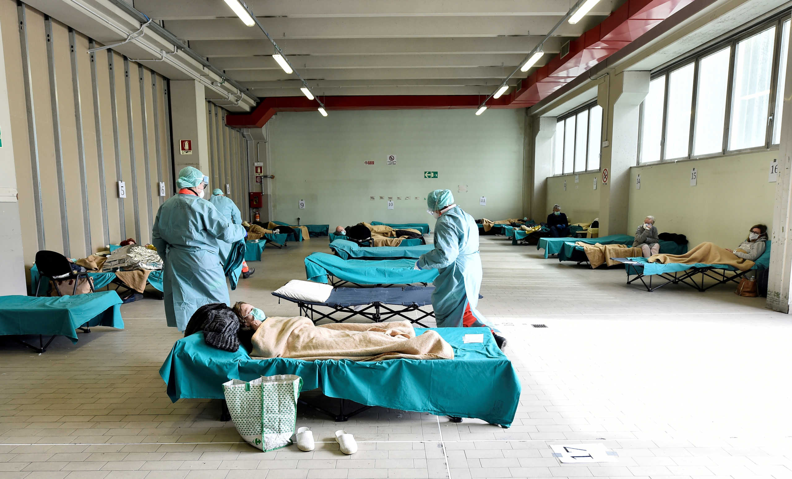 Medical personnel wearing protective face masks help patients inside the Spedali Civili hospital in Brescia, Italy March 13, 2020. REUTERS/Flavio Lo Scalzo     TPX IMAGES OF THE DAY