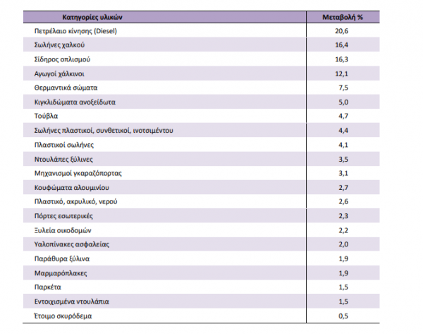 Οι κυριότερες μεταβολές των επιμέρους δεικτών τιμών κατηγοριών υλικών σε ετήσια βάση ήταν οι ακόλουθες:
