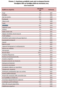 Την ίδια ώρα, ο Εναρμονισμένος Δείκτης Τιμών Καταναλωτή (ΕνΔΤΚ) του μηνός Οκτωβρίου 2021 , παρουσίασε αύξηση 2,8% έναντι μείωσης 2,0% που σημειώθηκε κατά την αντίστοιχη σύγκριση του έτους 2020 με το 2019 σε σύγκριση με τον αντίστοιχο Δείκτη του Οκτωβρίου 2020.