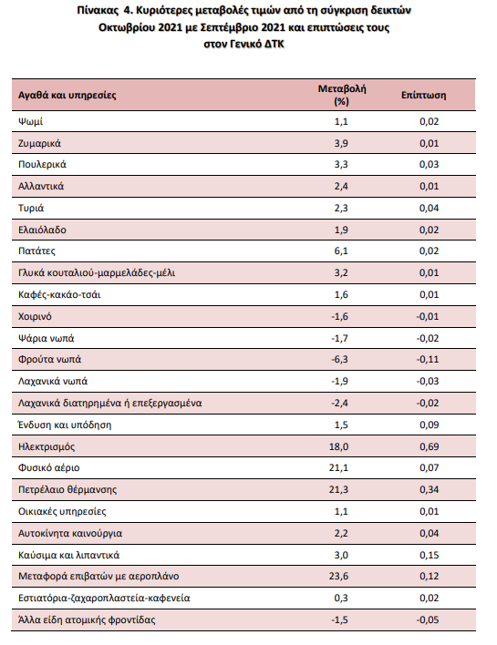 Η αύξηση του Γενικού ΔΤΚ κατά 3,4% τον μήνα Οκτώβριο 2021, σε σύγκριση με τον αντίστοιχο Δείκτη του Οκτωβρίου 2020, προήλθε κυρίως από τις μεταβολές στις ακόλουθες ομάδες αγαθών και υπηρεσιών: