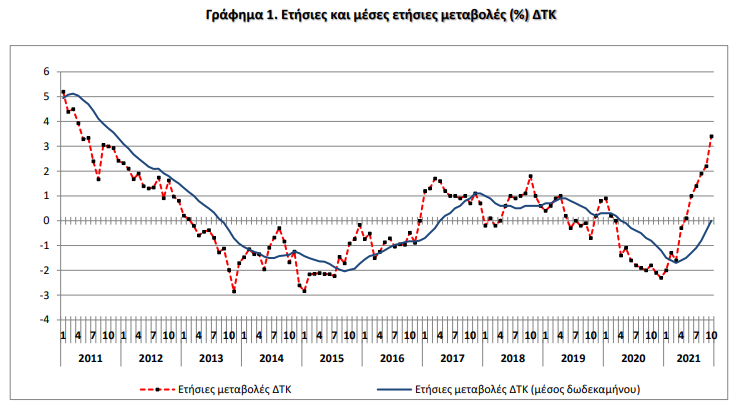 Ο μέσος ΔΤΚ του δωδεκαμήνου Νοεμβρίου 2020 – Οκτωβρίου 2021, σε σύγκριση με τον αντίστοιχο Δείκτη του δωδεκαμήνου Νοεμβρίου 2019 – Οκτωβρίου 2020, δεν παρουσίασε μεταβολή έναντι μείωσης 0,8% που σημειώθηκε κατά την αντίστοιχη σύγκριση