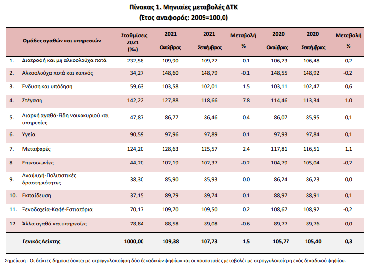 Ο Γενικός ΔΤΚ κατά τον μήνα Οκτώβριο 2021, σε σύγκριση με τον Σεπτέμβριο 2021, παρουσίασε αύξηση 1,5% έναντι αύξησης 0,3% που σημειώθηκε κατά την αντίστοιχη σύγκριση του προηγούμενου έτους.