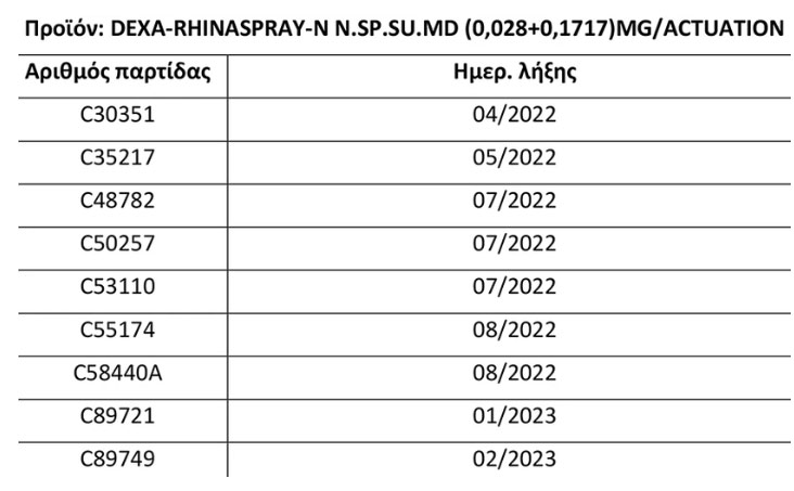 Στην ανάκληση του σπρέι μύτης DEXA-RHINASPRAY-N N.SP.SU.MD (0,028+0,1717)MG/ACTUATION.