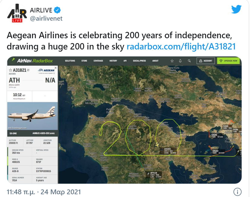 Σε ρυθμούς 200 χρόνων από την Ελληνική Επανάσταση πετάει η Aegean Airlines, της οποίας αεροσκάφος τίμησε με τον καλύτερο τρόπο τη μεγάλη εθνική μας επέτειο. Πέταξε πάνω από την Πελοπόννησο, σχηματίζοντας με την πορεία του τον αριθμό 200.