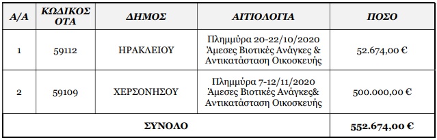 Εγκρίνουμε, βάσει των ανωτέρω, με χρέωση του λογαριασμού του Υπουργείου Εσωτερικών που τηρείται στο Ταμείο Παρακαταθηκών και Δανείων υπό τον τίτλο «Κάλυψη των πάσης φύσεως αναγκών των ΟΤΑ κ.λπ.», τη χορήγηση έκτακτης οικονομικής ενίσχυσης ποσού, ύψους 552.674,00€ στους Δήμους Ηρακλείου Κρήτης και Χερσονήσου, αποκλειστικά και μόνο για τη χορήγηση των οικονομικών ενισχύσεων της υπ’ αρίθμ. 33862/06-05-2019 κοινής απόφασης των