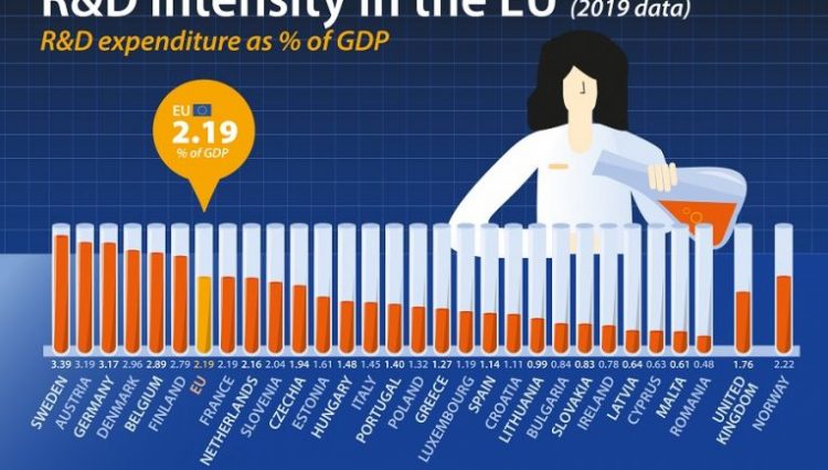Το 2019, η υψηλότερη ένταση Ε & Α καταγράφηκε στη Σουηδία (3,39%), ακολουθούμενη από την Αυστρία (3,19%) και τη Γερμανία (3,17%), όλες με δαπάνες Ε & Α άνω του 3% του ΑΕΠ. Ήταν μπροστά από τη Δανία (2,96%), το Βέλγιο (2,89%) και τη Φινλανδία (2,79%), με όλες τις δαπάνες Ε & Α να πλησιάζουν το 3,0% του ΑΕΠ.