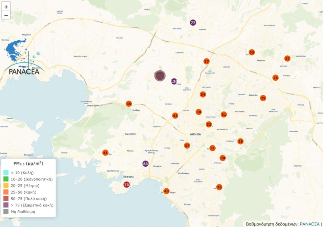 Στον χάρτη που αποτυπώνονται οι μετρήσεις από 11 αισθητήρες του Εθνικού Αστεροσκοπείου, η Πετρούπολη έχει το πιο «βαθύ κόκκινο», αφού από το βράδυ της Τρίτης οι συγκεντρώσεις σωματιδίων δεν έχουν πέσει κάτω από τα 100 μικρογραμμάρια, ενώ η σύσταση είναι οι κάτοικοι να μένουν σπίτι, με διαρκή λειτουργία κλιματισμού ειδικά εάν υπάρχουν ευάλωτες ομάδες και «απαγορευτικό» σε δραστηριότητες όπως τρέξιμο. Η λιγότερο επιβαρυμένη περιοχή, είναι η Γλυφάδα.