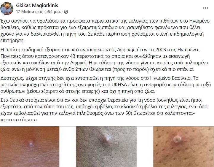 «Σε κάθε περίπτωση δεν είναι μία επιδημική έξαρση όπως αυτές που γνωρίζαμε για αυτόν τον ιό και έχουμε συνηθίσει, και συνεπώς είναι σημαντικό να σκεφτούμε out of the box, καθώς υπάρχει η πιθανότητα να βλέπουμε μία σημαντική αλλαγή συμπεριφοράς του ιού ως αποτέλεσμα και της μειωμένης ανοσίας από το εμβόλιο της ευλογιάς. Χωρίς να πιστεύω ότι υπάρχει άμεσα λόγος ανησυχίας, θα έλεγα ότι τα στοιχεία δείχνουν ανάγκη για αυξημένη επαγρύπνηση» καταλήγει ο κ. Μαγορκίνης.