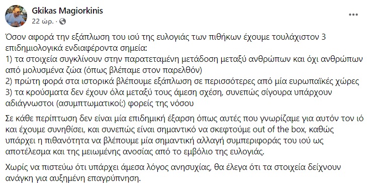 Σε ανάρτησή του ο καθηγητής Επιδημιολογίας, Γκίκας Μαγιορκίνης, επισημαίνει την ανάγκη για αυξημένη επαγρύπνηση. Παράλληλα κάνει λόγο για τουλάχιστον 3 επιδημιολογικά ενδιαφέροντα σημεία: 1) τα στοιχεία συγκλίνουν στην παρατεταμένη μετάδοση μεταξύ ανθρώπων και όχι ανθρώπων από μολυσμένα ζώα (όπως βλέπαμε στον παρελθόν), 2) πρώτη φορά στα ιστορικά βλέπουμε εξάπλωση σε περισσότερες από μία ευρωπαϊκές χώρες και 3) τα κρούσματα δεν έχουν όλα μεταξύ τους άμεση σχέση, συνεπώς σίγουρα υπάρχουν αδιάγνωστοι (ασυμπτωματικοί;) φορείς της νόσου.