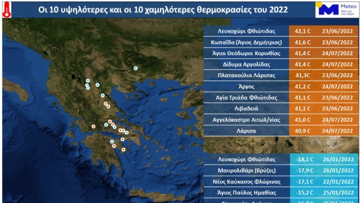 Το 2022 αποτέλεσε σε επίπεδο θερμοκρασιών ακόμα μια θερμή χρονιά για τις περισσότερες περιοχές της χώρας, κατά τη διάρκεια των περισσότερων μηνών, με αποκορύφωμα τις περιόδους 22-23 Ιουνίου και 23-29 Ιουλίου, σύμφωνα με τις καταγραφές του δικτύου αυτόματων μετεωρολογικών σταθμών του Εθνικού Αστεροσκοπείου Αθηνών/meteo.gr. Οι χαμηλότερες θερμοκρασίες του έτους καταγράφηκαν κυρίως κατά τη διάρκεια της κακοκαιρίας ΕΛΠΙΣ (23-25 Ιανουαρίου).