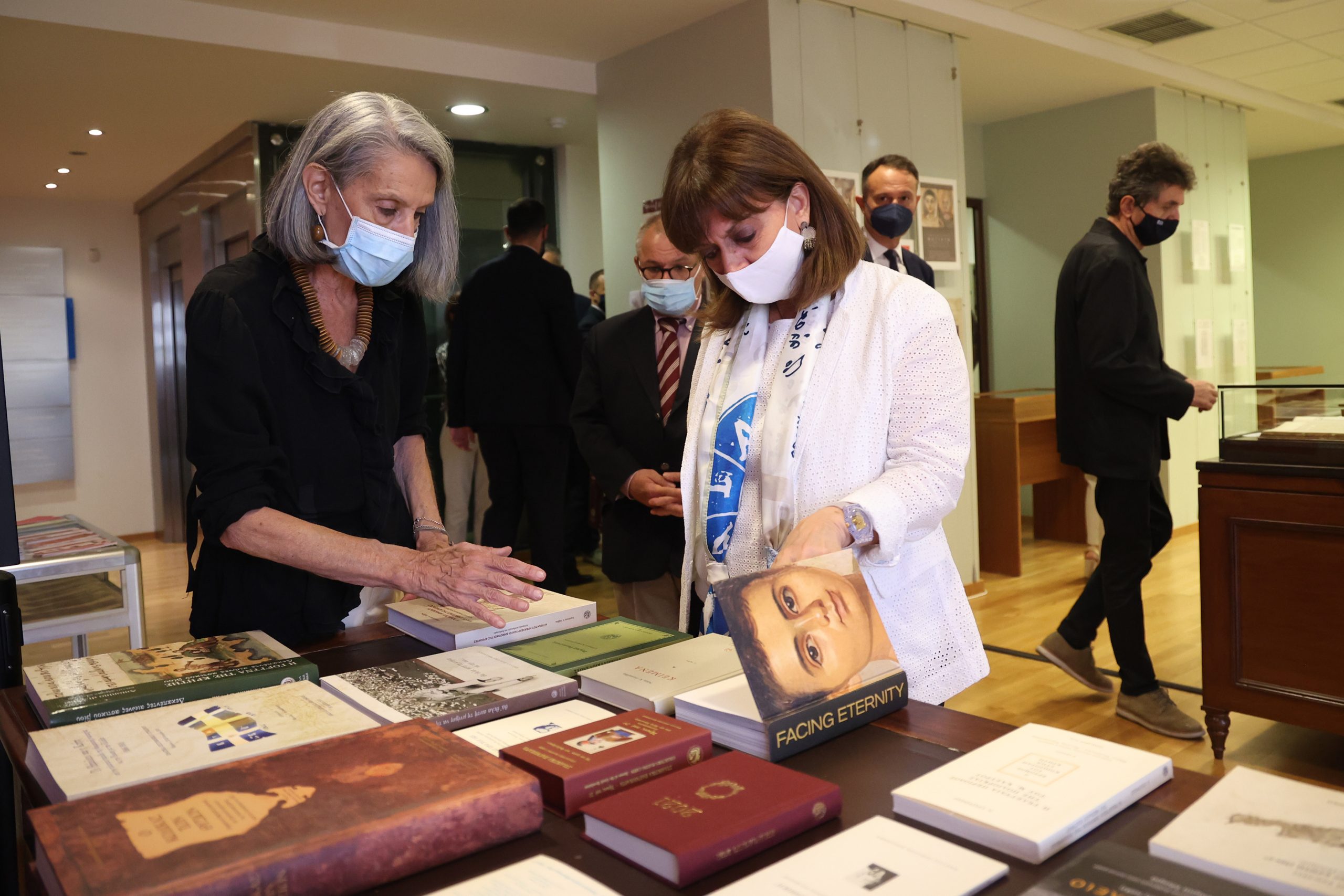 Εν συνεχεία, παρουσία του κ. Πασπάτη και της κ. Πλεύρη, η Πρόεδρος ξεναγήθηκε στην Βικελαία Δημοτική Βιβλιοθήκη, όπου ενημερώθηκε για τις πολύ ενδιαφέρουσες συλλογές που φιλοξενεί (όπως το αρχείο του Γιώργου Σεφέρη) καθώς και για την διαδικασία συντήρησης των πολύτιμων παλαιτύπων τα οποία διαθέτει.