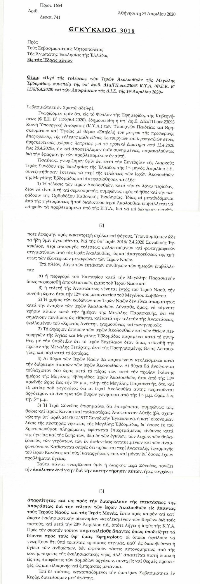 Η Ιερά Σύνοδος, σε εφαρμογή της Κοινής Υπουργικής Απόφασης (ΚΥΑ), για Θείες Λειτουργίες κεκλεισμένων των θυρών την περίοδο του Πάσχα, εξέδωσε ένα «οδηγό» προς Ιεράρχες και εφημέριους ναών.