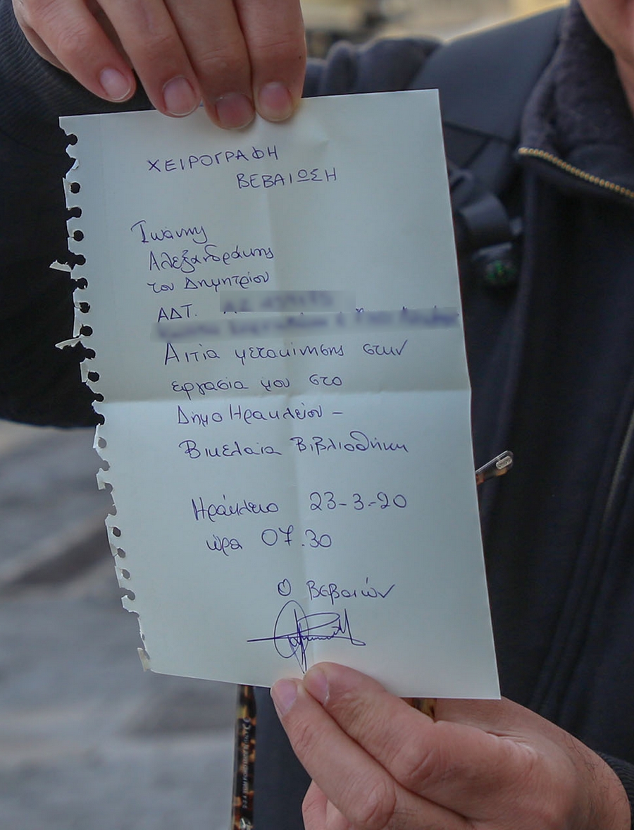 Όπως ο κύριος της φωτογραφίας, ο οποίος με χειρόγραφο φρόντισε να «εξοπλιστεί» με τη σχετική άδεια ώστε να μπορέσει να πάει στην εργασία του.