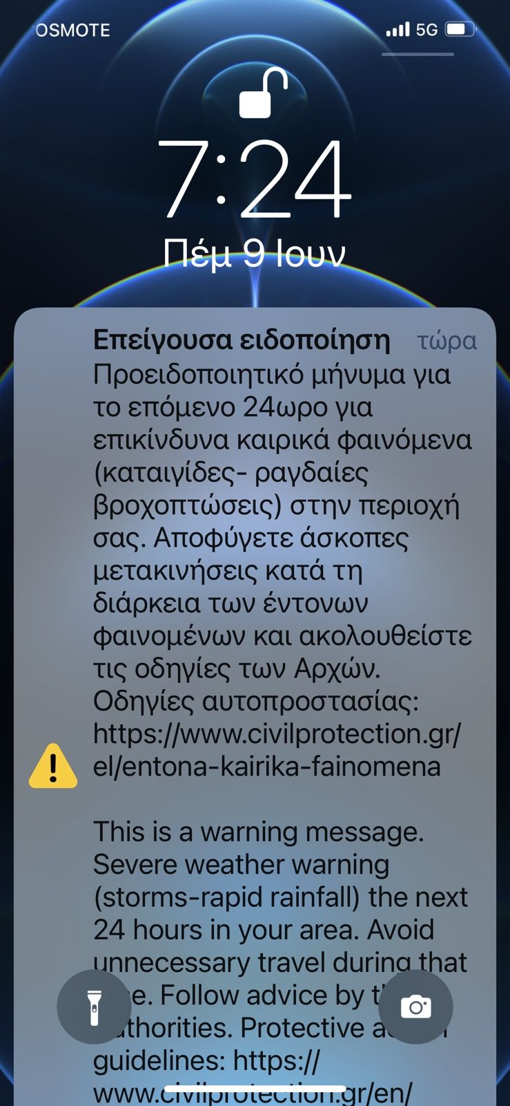 Η Γενική Γραμματεία Πολιτικής Προστασίας έχει επικοινωνήσει προσωπικά με κάθε περιφερειάρχη, ενημερώνοντας για τους κινδύνους. Ήδη, μήνυμα 1από το 112 έχουν λάβει από την Πέμπτη κάτοικοι στη Θεσσαλονίκη και σε περιοχές της Θεσσαλίας και της Δυτικής Ελλάδας, ενώ θα σταλεί ανάλογα με τις προβλέψεις κατά τόπους και σε όλες τις περιοχές που θα βρεθούν στο επίκεντρο της κακοκαιρίας, με ισχύ 24ώρου.