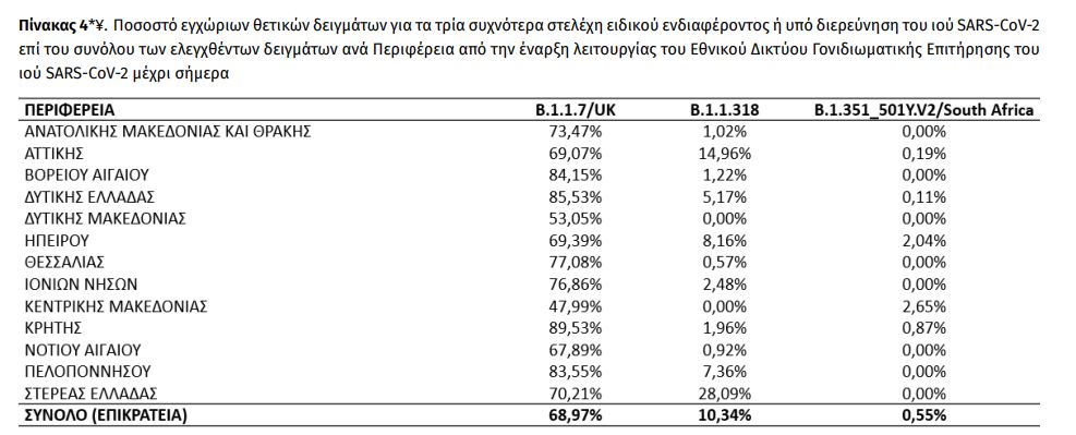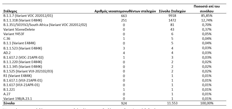 Από την έναρξη λειτουργίας του Εθνικού Δικτύου Γονιδιωματικής Επιτήρησης του ιού SARS-CoV-2 μέχρι σήμερα έχουν ελεγχθεί στην επικράτεια συνολικά 14.240 δείγματα από εγχώρια κρούσματα, εκ των οποίων τα τρία πιο συχνά στελέχη ειδικού ενδιαφέροντος ή υπό διερεύνηση που έχουν απομονωθεί είναι το Β.1.1.7/UK lineage (Variant VOC 202012/01), με ποσοστό 68,97%, ακολουθούμενο από το B.1.1.318 (Variant E484K) με ποσοστό 10,34% και το B.1.351/501Y.V2/South Africa (Variant VOC 202012/02) με ποσοστό 0,55%.