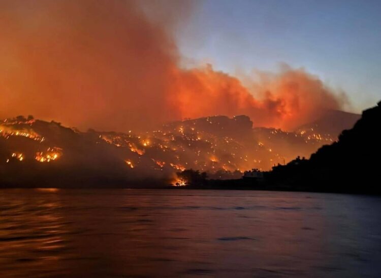 Σύμφωνα με πληροφορίες, το πύρινο μέτωπο ξεπερνά τα 7-8χιλιόμετρα, έχει φτάσει στη θάλασσα, όπως αναφέρεται χαρακτηριστικά, ενώ στην περιοχή πνέουν άνεμοι 10 μποφόρ.