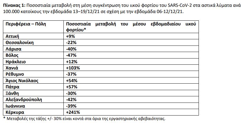 Όπως προκύπτει από τις αναλύσεις δειγμάτων την εβδομάδα από 13 έως 19 Δεκέμβρη, καταγράφονται “πτωτικές τάσεις” σε επτά από τις 13 περιοχές, ενώ “έκρηξη” του ιικού φορτίου παρατηρείται στην Κέρκυρα (+241%) και μεγάλη αύξηση στα Χανιά (+103%).
