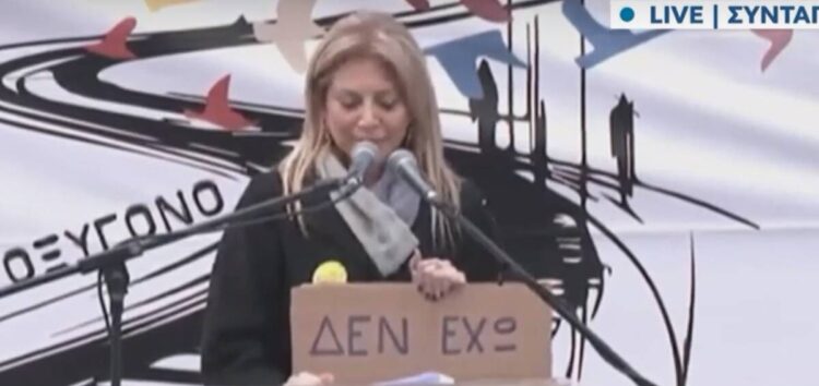 Κρατώντας ένα πανό που έγραφε «δεν έχω οξυγόνο», η Μαρία Καρυστιανού βρέθηκε στο μεγάλο συλλαλητήριο της Αθήνας και ανέβηκε στο βήμα στην πλατεία του Συντάγματος, μιλώντας για τις 57 ψυχές που χάθηκαν την ημέρα της τραγωδίας των Τεμπών.