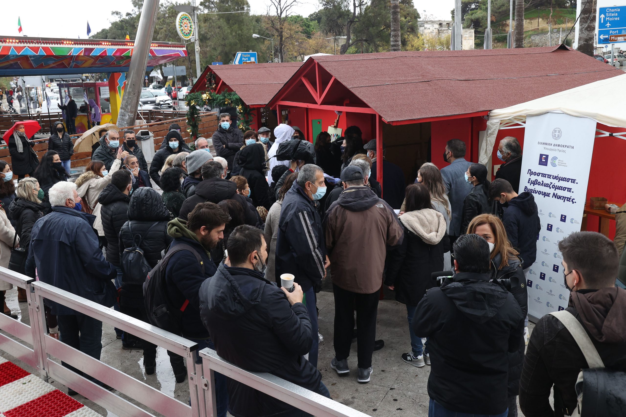 Πλήθος κόσμου σπεύδει από τις έντεκα το πρωί να εμβολιαστεί κατά της Covid-19 χωρίς ραντεβού στην Πλατεία Ελευθερίας, μέσα στο χριστουγεννιάτικο χωριό που έχει στηθεί.