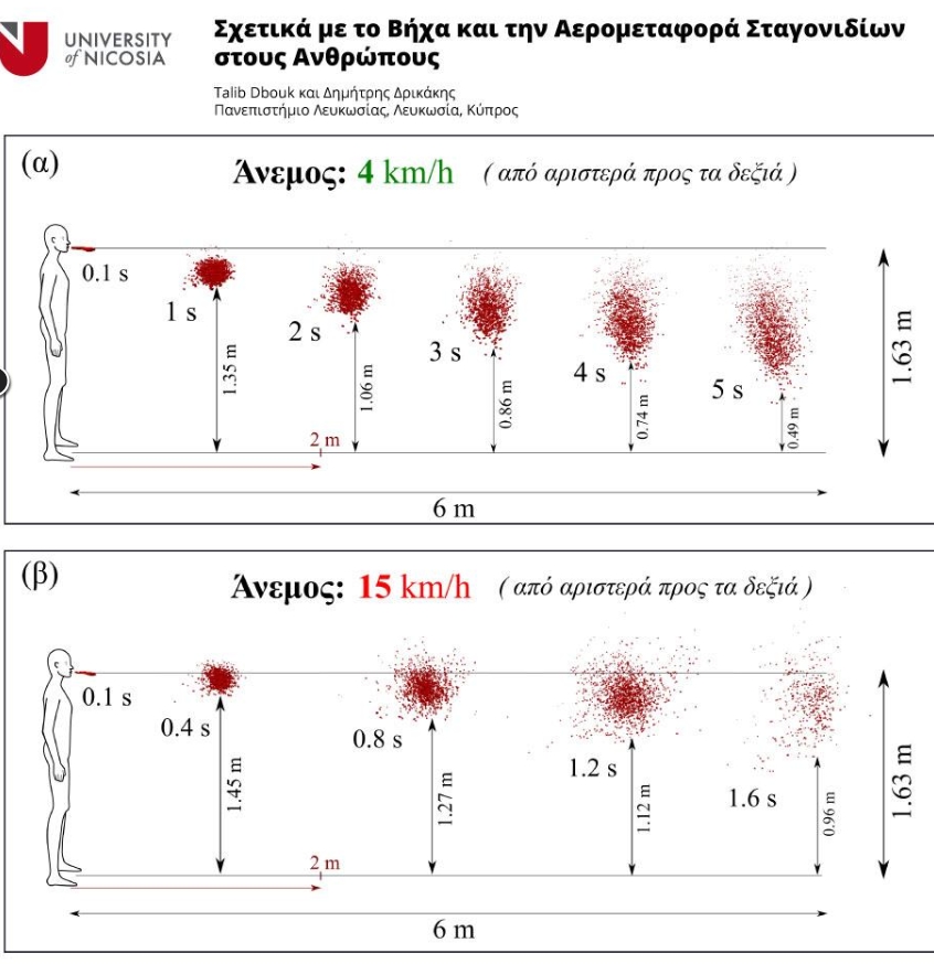 «Ανεπαρκείς μπορεί να είναι οι τρέχουσες οδηγίες κοινωνικής απόστασης των δύο μέτρων» αναφέρει άρθρο ερευνητών του Πανεπιστημίου Λευκωσίας, στο οποίο τεκμηριώνουν ότι ένας ήπιος βήχας σε συνδυασμό με χαμηλές ταχύτητες ανέμου 4-15 km/h, είναι δυνατό να μεταφέρει σταγονίδια σιέλου σε απόσταση 6 μέτρων.