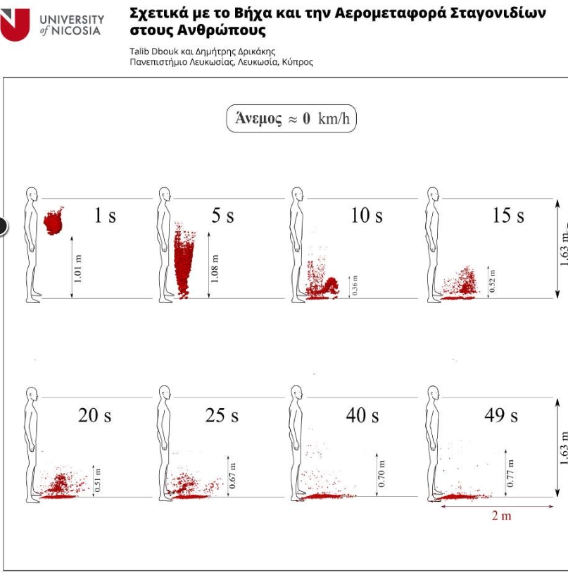 Σε άρθρο με τίτλο «Σχετικά με το βήχα και την αερομεταφορά σταγονιδίων στους ανθρώπους» (On coughing and airborne droplet transmission to humans), που δημοσιεύθηκε αυτή την εβδομάδα στο επιστημονικό περιοδικό Physics of Fluids, του Αμερικανικού Ινστιτούτου Φυσικής, οι Talib Dbouk (Ερευνητής Συνεργάτης) και Δημήτρης Δρικάκης (Καθηγητής) του Πανεπιστημίου Λευκωσίας, υποστήριξαν ότι ακόμη και με ένα ελαφρύ αεράκι 4 km/h, το σάλιο μεταφέρεται 6 μέτρα σε μια περίοδο 5 δευτερολέπτων. Η δημοσίευση έχει ήδη κεντρίσει το ενδιαφέρον μεγάλων ειδησεογραφικών μέσων από όλο τον κόσμο (όπως το CNN, Fox News, Daily Mail, Gulf News, Indian Express, και Newsweek), καθώς και σημαντικών επιστημονικών ιστοτόπων (ZME Science, IEEE Spectrum).