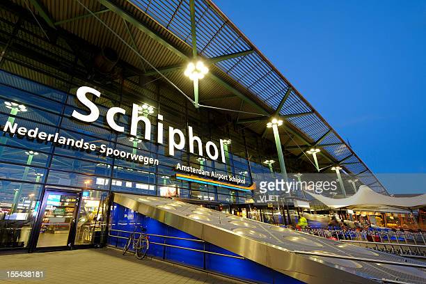 The entrance of Amsterdam Airport Schiphol in the evening. Schiphol is located 9 kilometers southwest of Amsterdam.