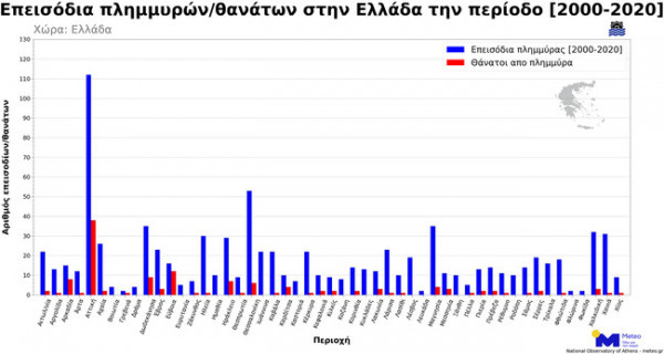 Στην Ελλάδα, την περίοδο 2000-2020, καταγράφηκαν πάνω από 380 επεισόδια πλημμύρας με αρνητικές κοινωνικές και οικονομικές επιπτώσεις, με 132 ανθρώπινες απώλειες αλλά και υλικές ζημιές και καταστροφές υποδομών, προβλήματα σε μετακινήσεις, κλπ.