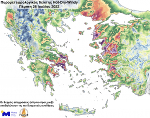 Αιτία της σημαντικής αυτής επιδείνωσης αποτελεί η αναμενόμενη ενίσχυση των βόρειων ανέμων στο Αιγαίο και την ανατολική ηπειρωτική Ελλάδα, σε συνδυασμό με τις πολύ θερμές και ξηρές συνθήκες που επικρατούν στη χώρα μας κατά τη διάρκεια των τελευταίων ημερών, και οι οποίες έχουν αυξήσει σημαντικά την ευφλεκτότητα των δασικών καυσίμων. Συνολικά, οι πυρομετεωρολογικές συνθήκες την Πέμπτη 28.07.2022 και την Παρασκευή 29.07.2022 αναμένεται να χαρακτηριστούν από τον ιδιαίτερα επικίνδυνο, για την εκδήλωση και εξάπλωση δασικών πυρκαγιών, τύπο καιρού Hot – Dry – Windy.