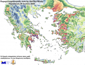 Τέλος, τα προγνωστικά στοιχεία που αυτή τη στιγμή είναι διαθέσιμα υποδεικνύουν συνέχιση των δυσμενών πυρομετεωρολογικών συνθηκών και το Σαββατοκύριακο 30-31.07.2022 στην ανατολική και νότια Ελλάδα, συμπεριλαμβανομένης της Αττικής, της Εύβοιας και τμημάτων της Πελοποννήσου και των νησιών του Αιγαίου.