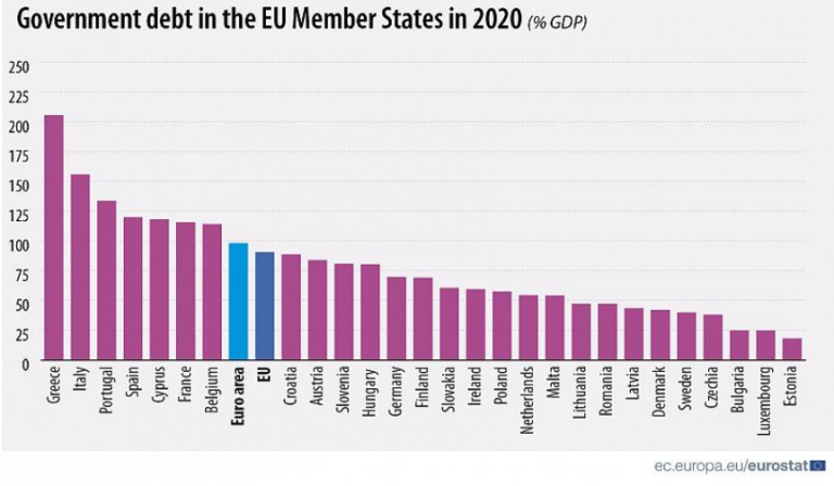 Στις περιπτώσεις της Γαλλίας ή της Ισπανίας, όμως, τα πράγματα είναι διαφορετικά, καθώς το δικό τους δημόσιο χρέος ανέρχεται πλέον στο 113% και 117% του ΑΕΠ αντιστοίχως. Το πρόβλημα γίνεται σε ανυπέρβλητο για την Ιταλία και την Ελλάδα, όπου τα αντίστοιχα ποσοστά ξεπερνούν το 150% και το 200% – πρακτικά, είτε το όριο είναι 60% είτε αυξηθεί στο 100% το χρέος τους είναι μη βιώσιμο.
