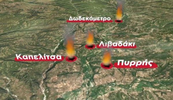 Η Καπελίτσα και το Δωδεκάμετρο είναι σε κρίσιμη κατάσταση. Οι φλόγες πέρασαν στο Λιβαδάκι μέσα στο χωριό. Έχουν καεί σπίτια και επιχειρήσεις. Έχουν εκκενωθεί 18 οικισμοί.