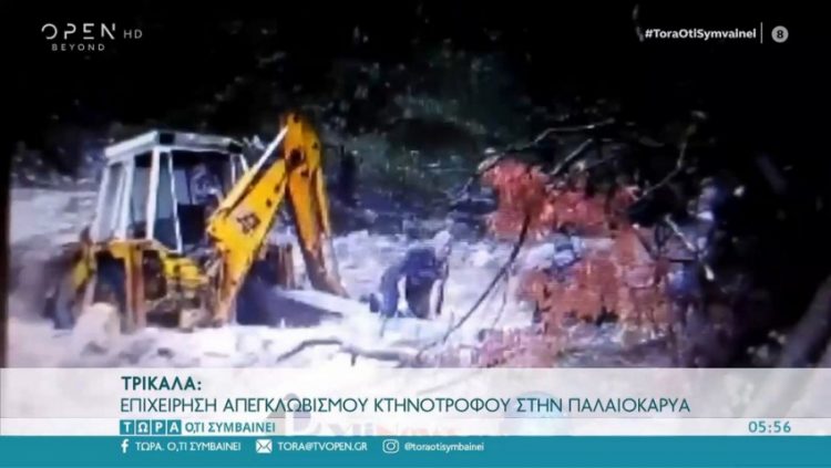 Αίσιο τέλος είχε η περιπέτεια ενός κτηνοτρόφου στην Παλαιοκαρυά στα Τρίκαλα, που είχε εγκλωβιστεί με το σκαπτικό μηχάνημά του στον ποταμό ο οποίος έχει μετατραπεί σε ορμητικό χείμαρρο.